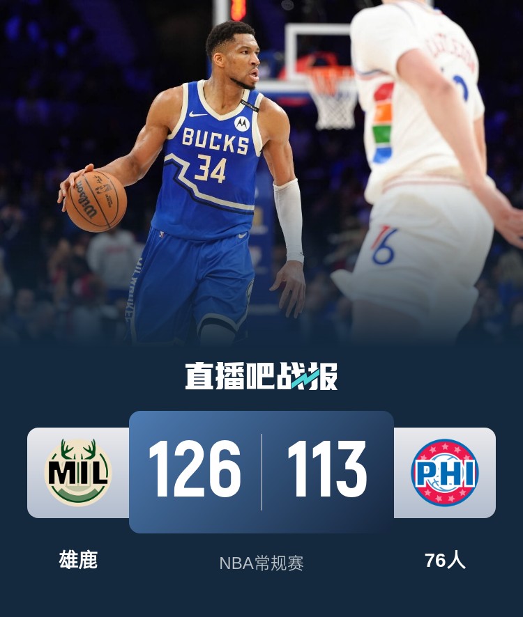 比赛开始,76人率先发力,贾里德-巴特勒连中三分率队打出8-0的开局,字母哥带队追赶,博纳高效终结,76人越战越勇将分差拉开到17分,此后却突然哑火,雄鹿大举反击轰出18-0的进攻高潮强势反超,半场战罢雄鹿61-59反超76人。易边再战,双方继续缠斗,博纳依然高效输出,雄鹿持续发力逐渐占据场上主动,末节纳斯被驱逐,雄鹿攻防两端压制对手不断扩大领先,76人苦苦追赶无果。最终,雄鹿126-113击败76人,送给对手10连败。
