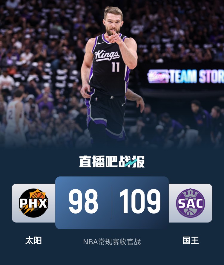 开场后拉文早早进入得分模式连续,他连续拿分帮国王取得领先,太阳加强防守掀起反扑将比分咬住,第二节瓦兰丘纳斯和萨博尼斯轮番进攻内线得手,不过太阳依旧顽强地咬住比分。易边再战,太阳虽然进攻打得还算不错,但他们防守完全没有限制住国王,国王多点开花将分差拉大到两位数。最后一节国王依旧牢牢维持住场上分差,双方都早早撤下主力,最终国王109-98击败太阳锁定西部第九。