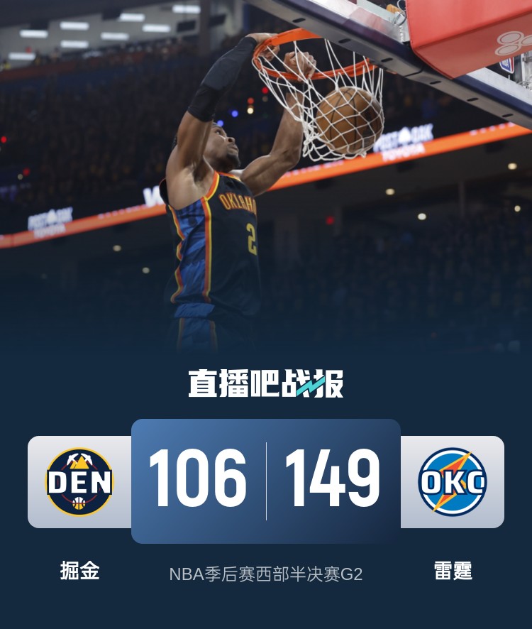 当前位置: 首页 > 篮球新闻 > 鸭梨34分&正负值+51 约基奇3节犯满 雷霆43分大胜掘金追至1-1