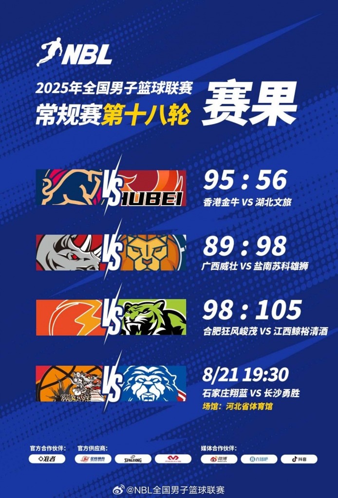 【战报】2025年NBL常规赛第18轮第二个比赛日两场比赛结束。广西威壮89:98不敌盐南苏科雄狮。广西队庞峥麟几乎打满全场,砍下39分2篮板6助攻...