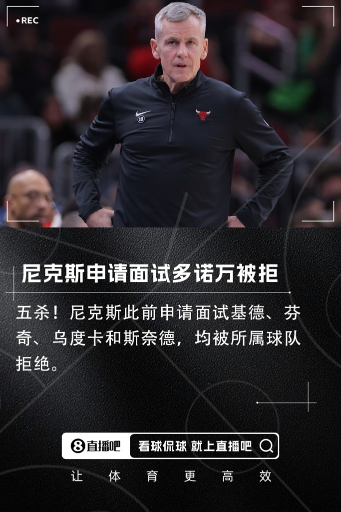06月12日讯 据公牛记者K.C. Johnson报道,多位消息人士透露,尼克斯曾就主教练职位空缺申请面试公牛主帅比利-多诺万,但是被芝加哥球队拒...