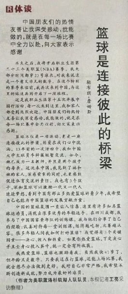 勒布朗发表的文章,本身四平八稳:被中国球迷所感动,重逢当年的球迷,赞美中国的篮球氛围与热情,展望自己下赛季,等等。但……在这份报纸...