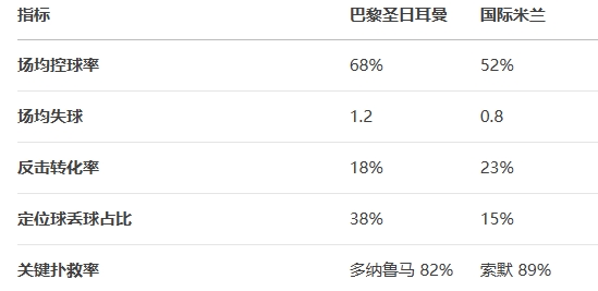 隐患定位球防守:本赛季欧冠丢球中38%源于定位球,而国米恰好擅长此道(邓弗里斯头球成功率71%)。