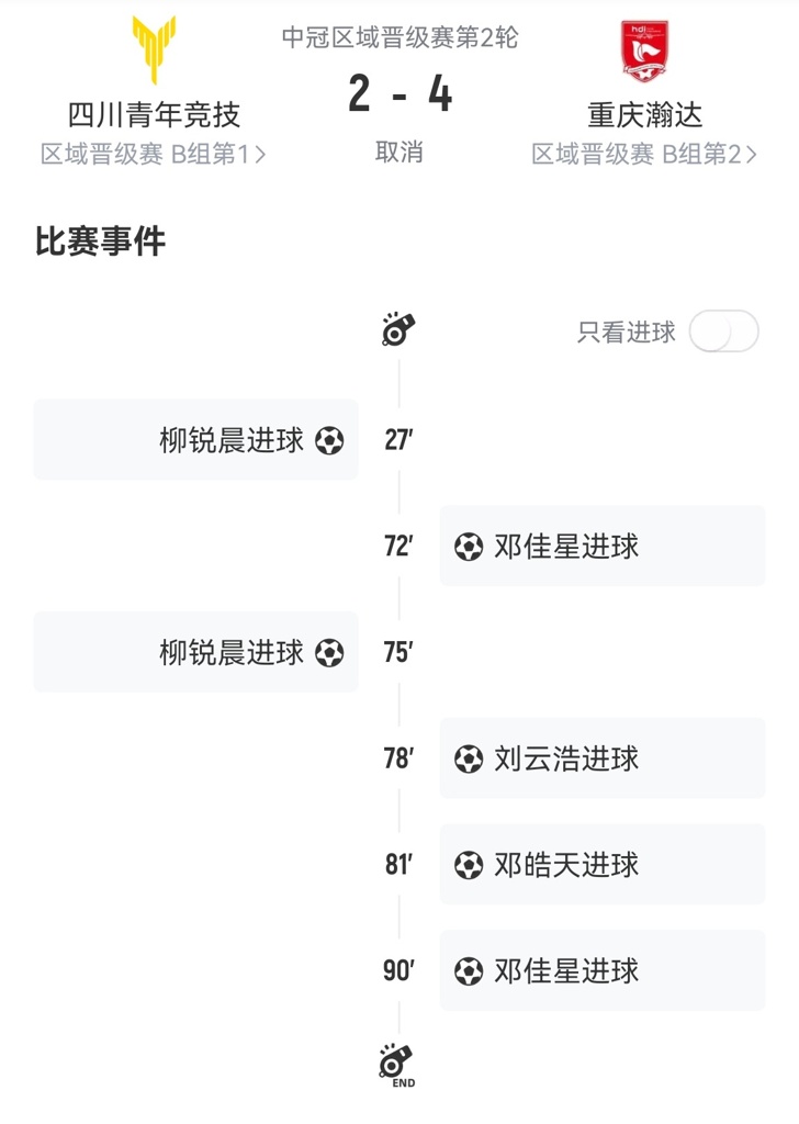 6月20日,中冠官方发布通报,6月3日中冠四川青年竞技 2-4 重庆瀚达的比赛中,经专家组评定,四川青年竞技队在该场比赛中非正常比赛(消极比赛)。