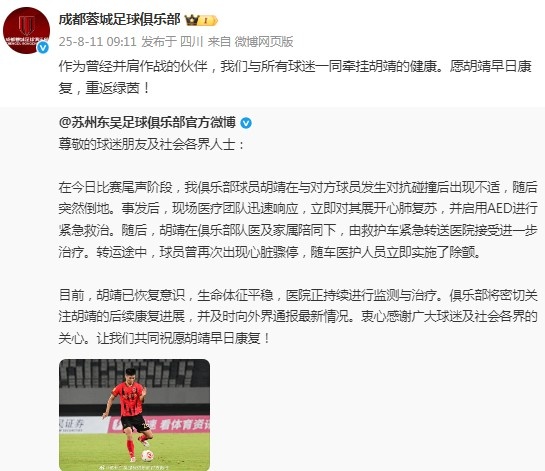 8月11日讯 在苏州东吴俱乐部公布胡靖的身体状况后,老东家成都蓉城俱乐部通过官博送上了祝福。