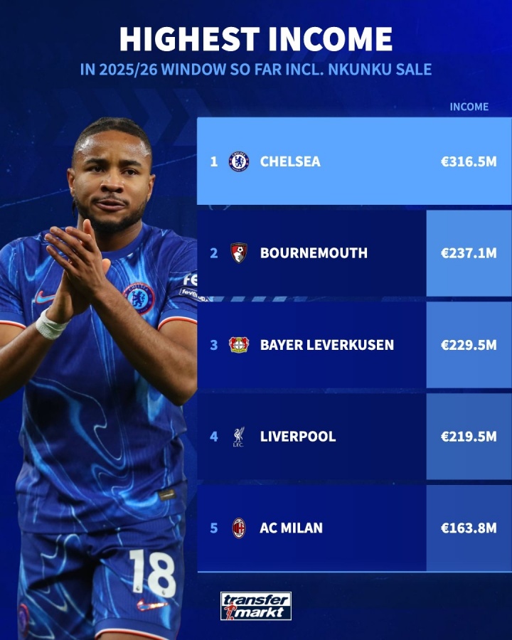 据德转统计,切尔西今夏卖人总收入将达到3.165亿欧元,冠绝全球,比卖人榜第二位的伯恩茅斯多了近8000万欧元。