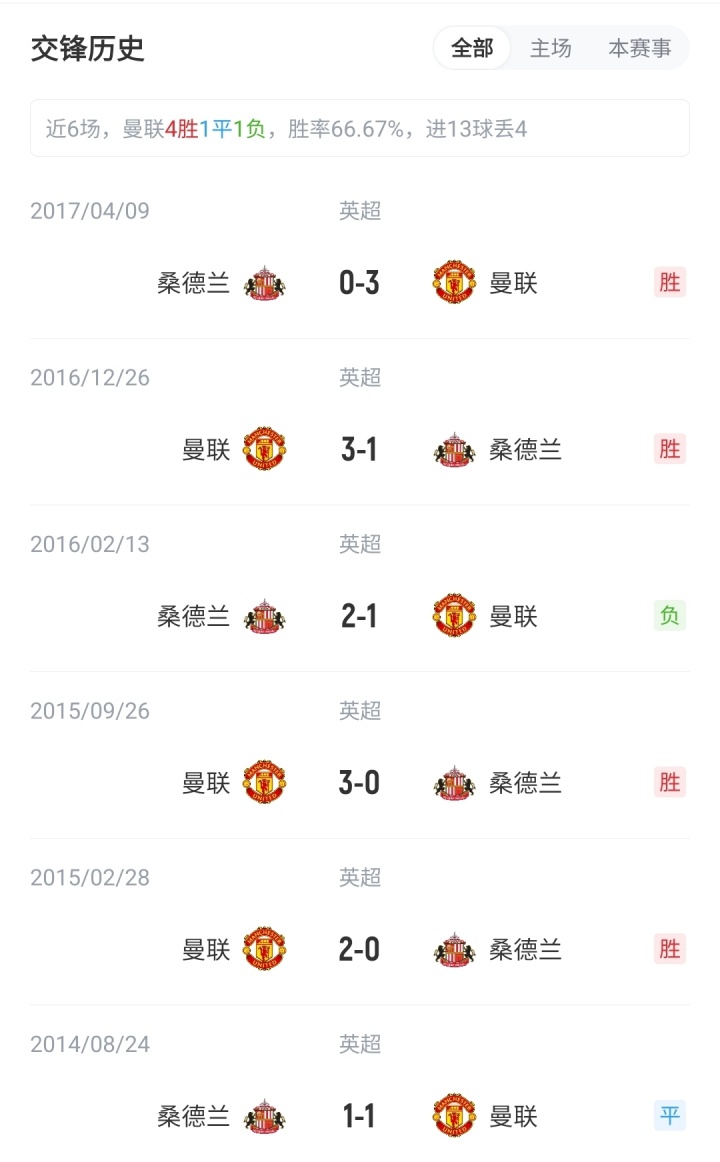 目前英超积分榜上,曼联2胜1平3负积7分,位列第14;升班马桑德兰3胜2平1负积11分,位列第6。