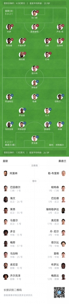 曼联首发:31-拉门斯、2-达洛特、4-德里赫特、15-约罗、23-卢克肖、16-阿玛德、18-卡塞米罗、8-B费、19-姆伯莫、30-舍什科、7-芒特