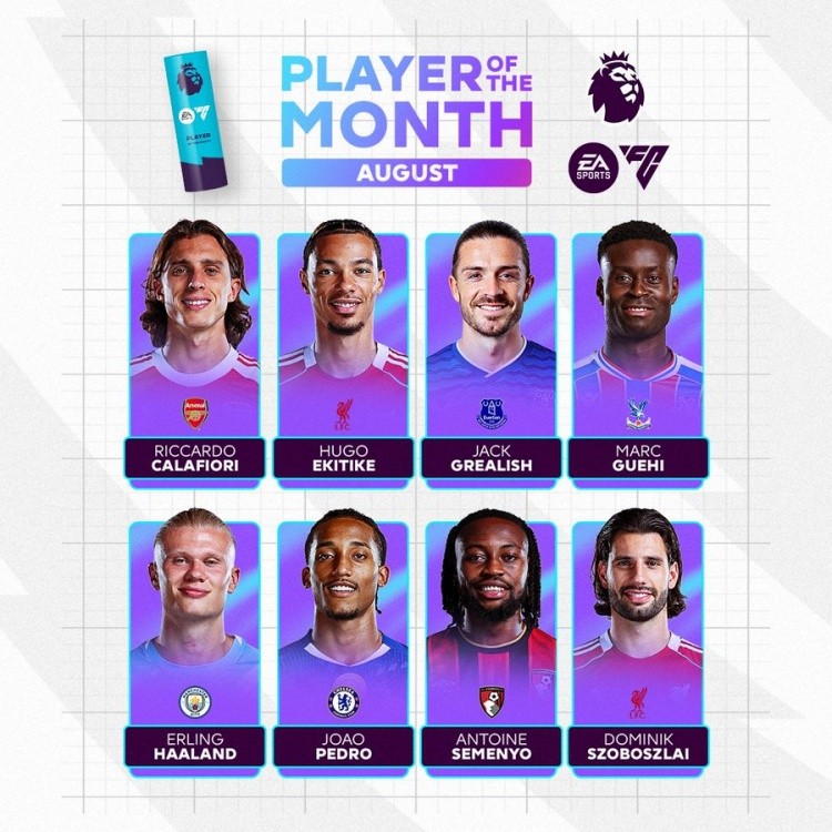 英超8月最佳候选:格拉利什、格伊、哈兰德在列,利物浦两将入选