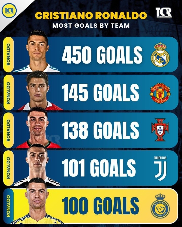 代表5队打入100球+!C罗939球分布:皇马时期438场450球