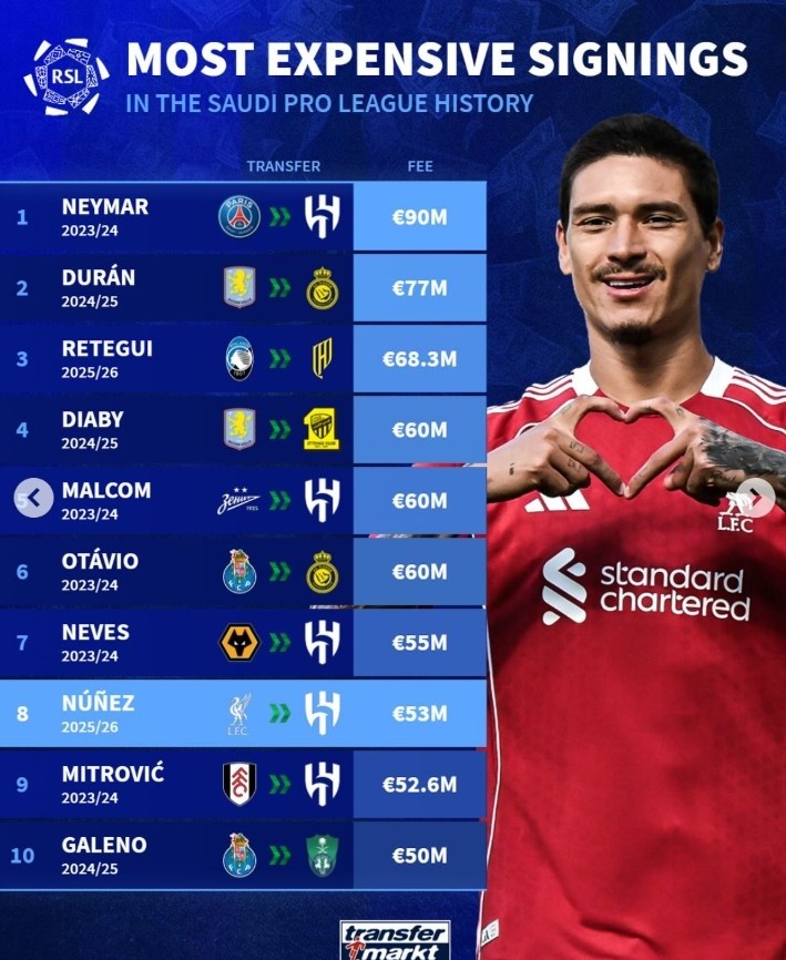 沙特引援转会费排行:内马尔9000万欧第1,杜兰第2,努涅斯第8