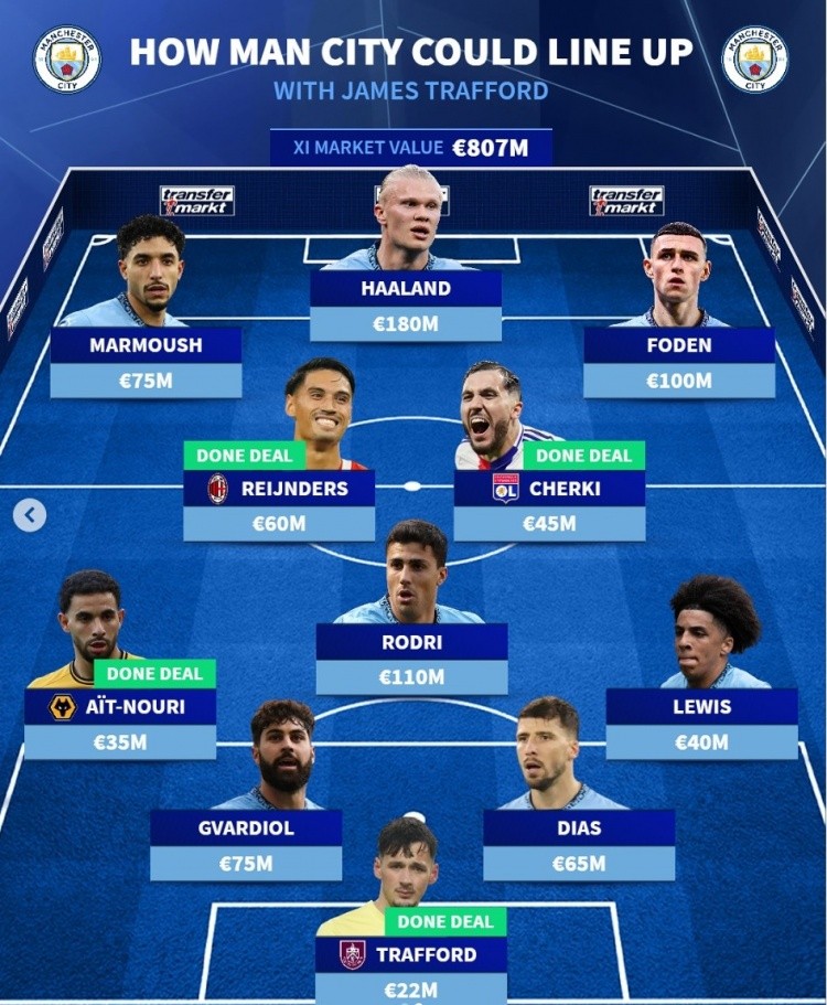 德转预测曼城新赛季主力阵:赖因德斯、特拉福德等4位新援在列