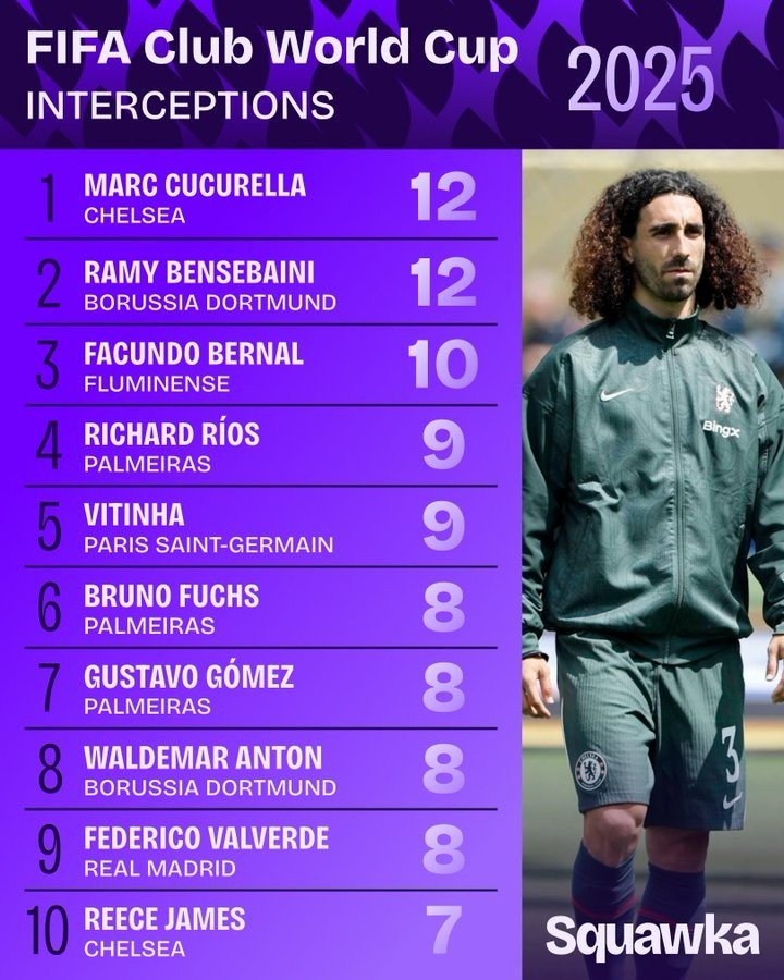 7月15日讯 Squawka统计了世俱杯赛事拦截次数排名,库库雷利亚和本塞拜尼12次并列第一。世俱杯拦截次数排名:1、库库雷利亚(切尔西)、本...