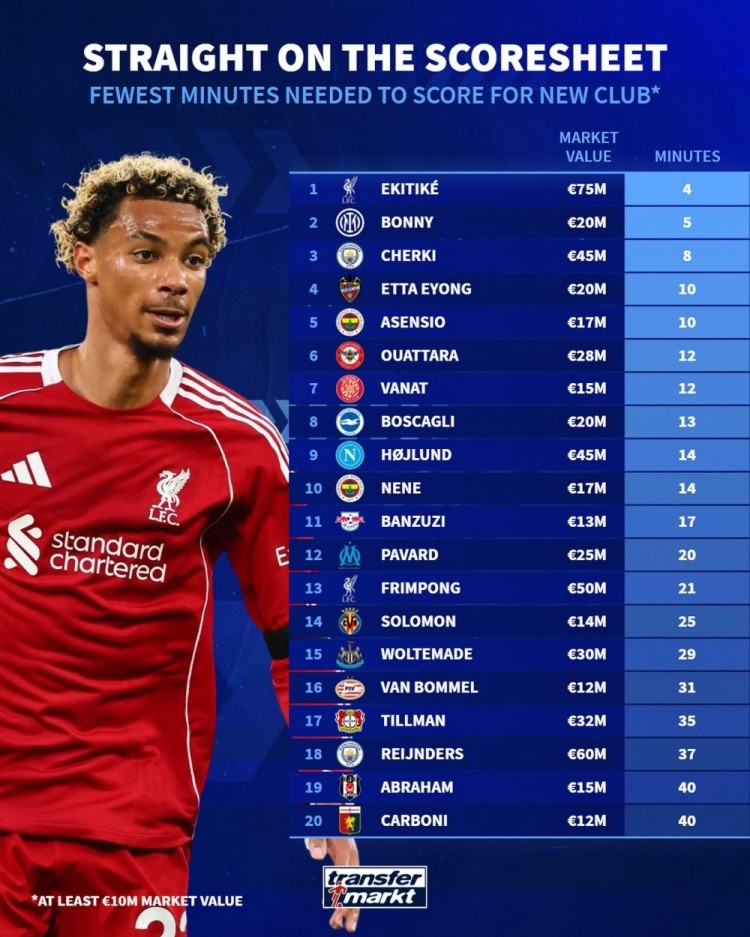 今夏新援最快攻入首球排名:埃基蒂克4分钟居首,博尼5分钟次席