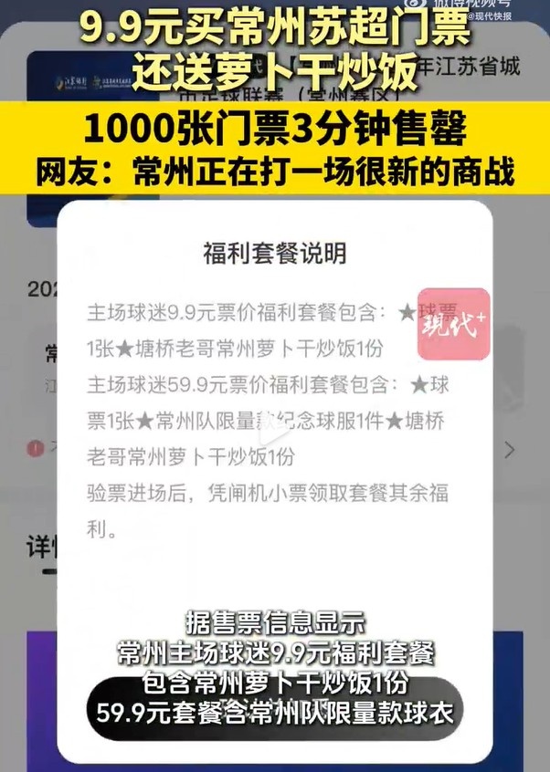 苏超常州主场1000张球票3分钟售罄,9.9元一张还送常州萝卜干炒饭