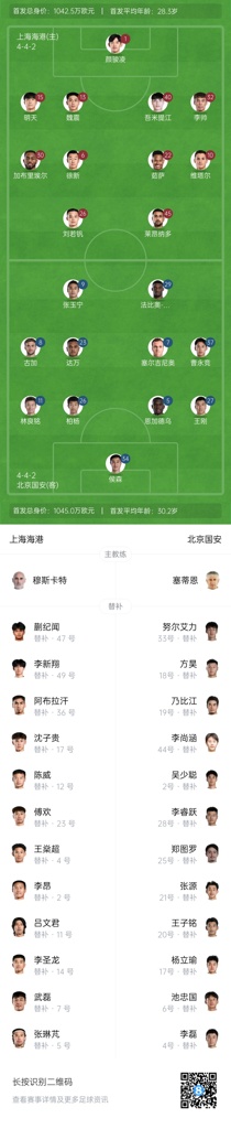05月01日讯 北京时间19:35,中超第10轮,上海海港主场迎战北京国安,双方公布首发名单。上海海港首发:1-颜骏凌、13-魏震、15-明天、32-李...