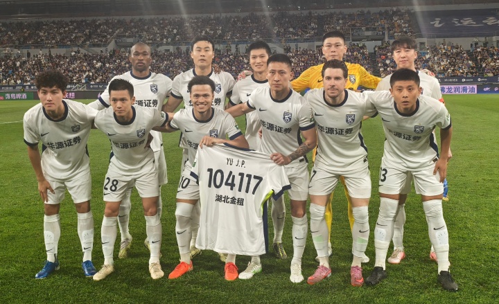 9月14日,在2025中超联赛第24轮武汉三镇客场对阵天津津门虎的比赛前,武汉三镇球员们手持印有号码“104117”的球衣入场,与这件特殊球衣合...